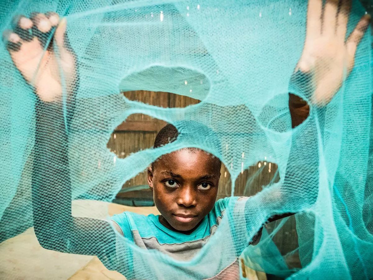 一個男孩指著自家一張舊蚊帳上的洞。在莫桑比克,盡管老一代蚊帳有助于保護家庭免受瘧疾侵襲,但它們也有缺點。這些蚊帳需要每六個月在殺蟲劑里浸泡一次,變臟后也不能重復清洗,不然就會留下蚊子可以穿越的洞。